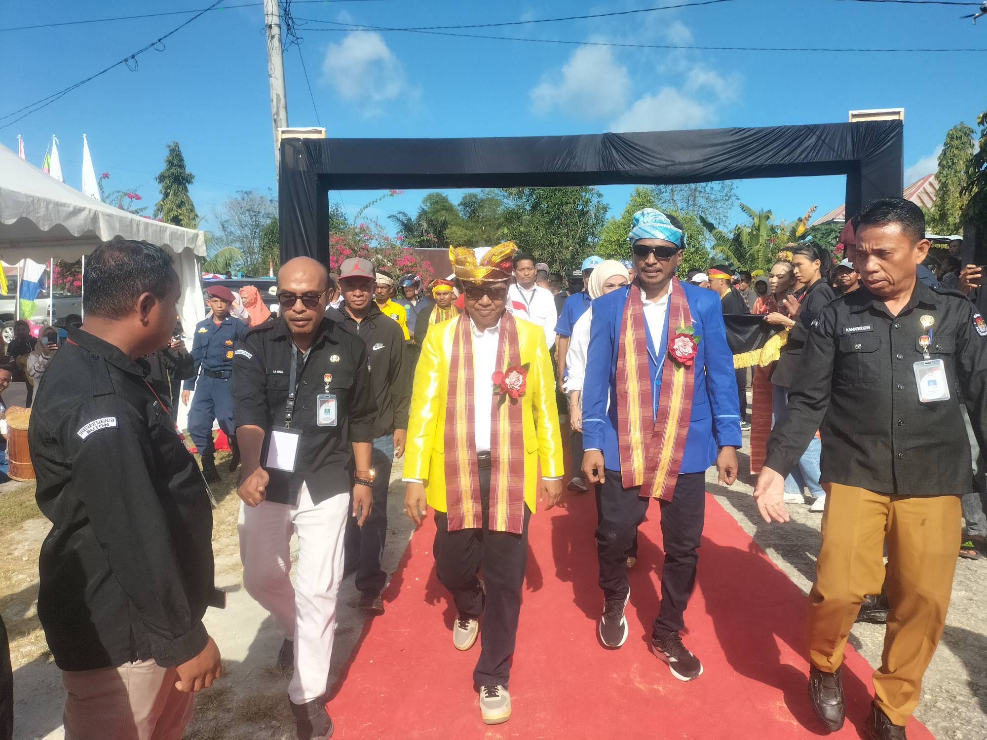 Pasangan ini kompak mengenakan baju kebesaran dari masing-masing partai pengusung dan kampurui (topi kain adat Buton). Bakry mengenakan kemeja Partai Golkar dan Wawan mengenakan kemeja biru Demokrat.