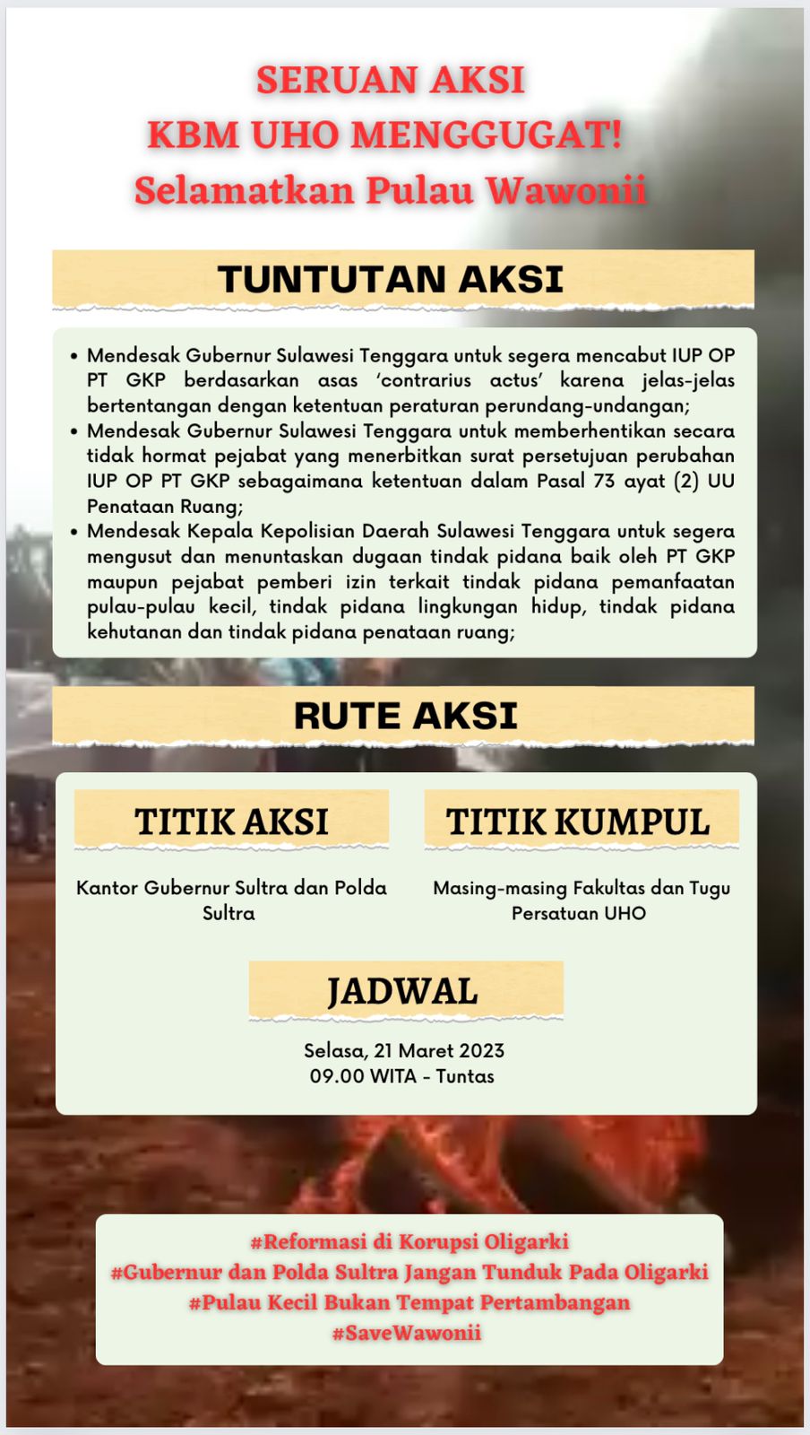 Dalam tuntutannya, KBM UHO akan menuntut pencabutan IUP milik PT GKP. Selain itu, mereka juga menuntut pihak berwenang yakni Polda Sultra untuk mengusut tuntas dugaan tindak pidana yang dilakukan, baik oleh pihak PT. GKP maupun pejabat pemberi izin terkait dugaan tindak pidana pemanfaatan pulau-pulau kecil, tindak pidana lingkungan, tindak pidana kehutanan dan tindak pidana penataan ruang.