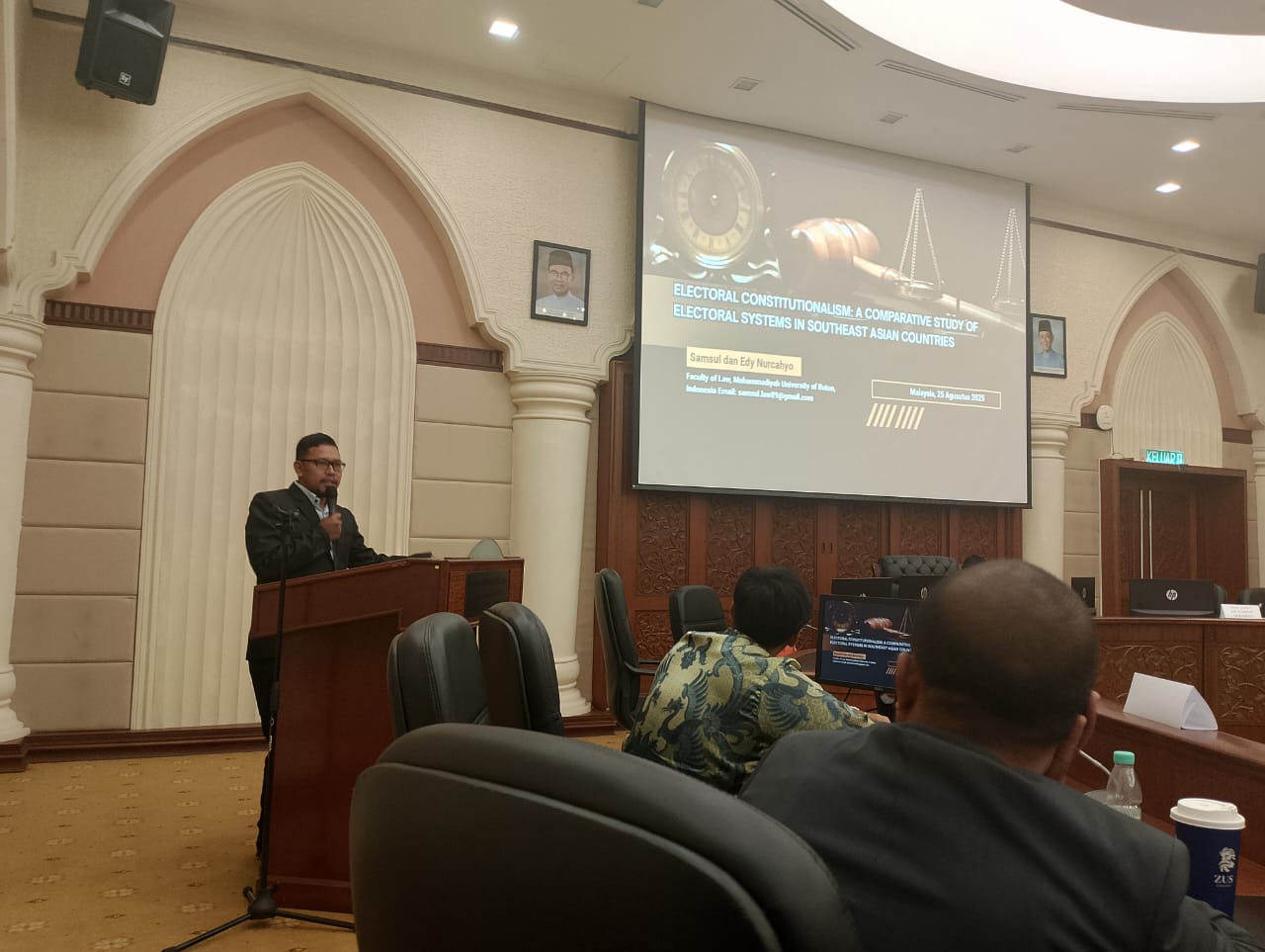 Sementara itu, Ketua Prodi Ilmu Hukum, Samsul, membawakan artikel berjudul “Electoral Constitutionalism: A Comparative Study of Electoral Systems in Southeast Asian Countries”. Dalam presentasinya, ia mengulas sistem pemilu di kawasan Asia Tenggara serta menyoroti bagaimana prinsip konstitusionalisme elektoral dapat menjadi tolok ukur kualitas demokrasi di setiap negara.