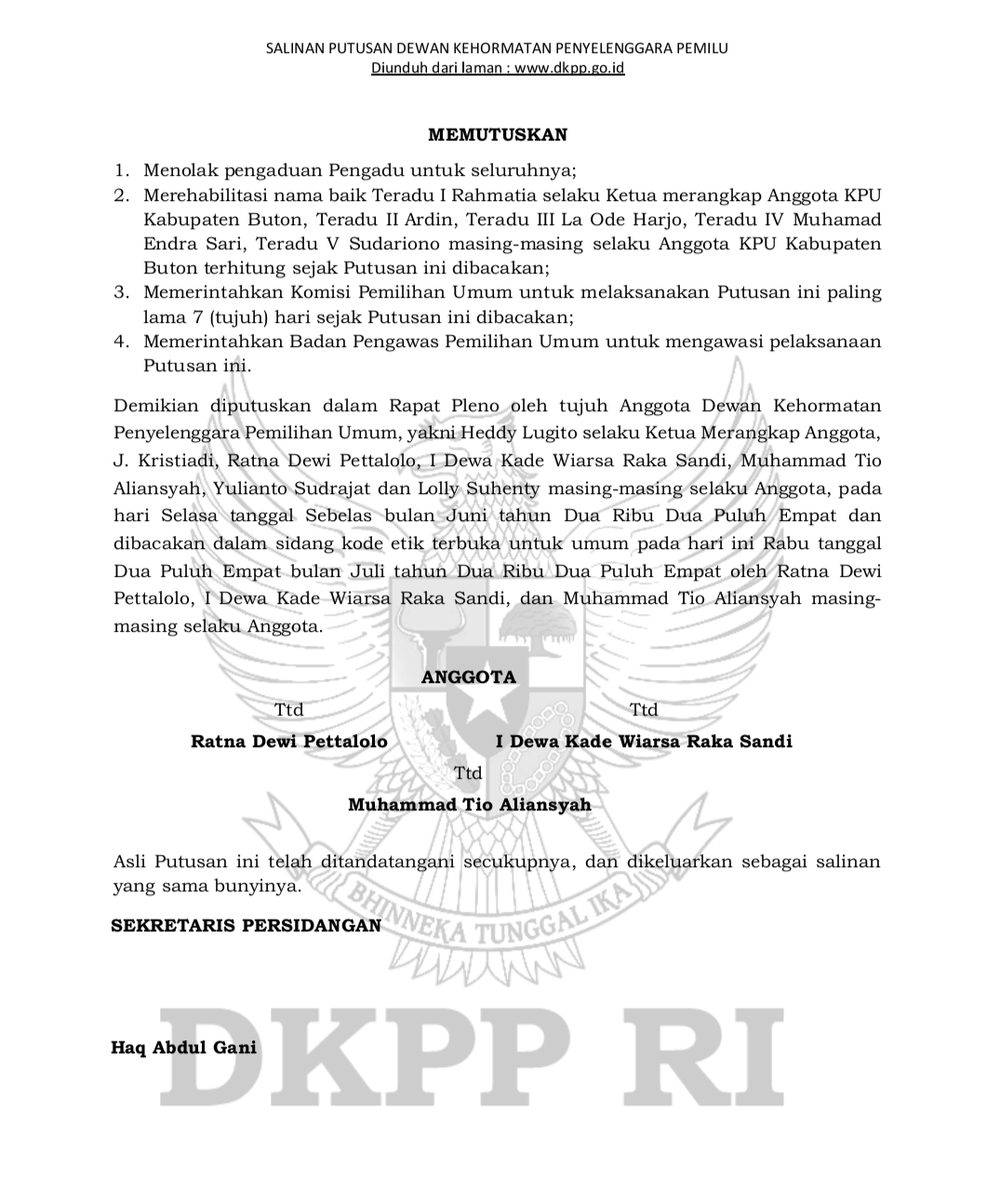 “Memutuskan, menolak pengaduan Pengadu untuk seluruhnya, merehabilitasi nama baik teradu I Rahmatia selaku Ketua merangkap Anggota KPU Kabupaten Buton, teradu II Ardin, teradu III La Ode Harjo, Teradu IV Muhamad Endra Sari, Teradu V Sudariono masing-masing selaku Anggota KPU Kabupaten Buton terhitung sejak Putusan ini dibacakan,” kata Majelis Hakim yang dipimpin oleh Ketua DKPP Heddy Lugito, Rabu (24/7/2024).