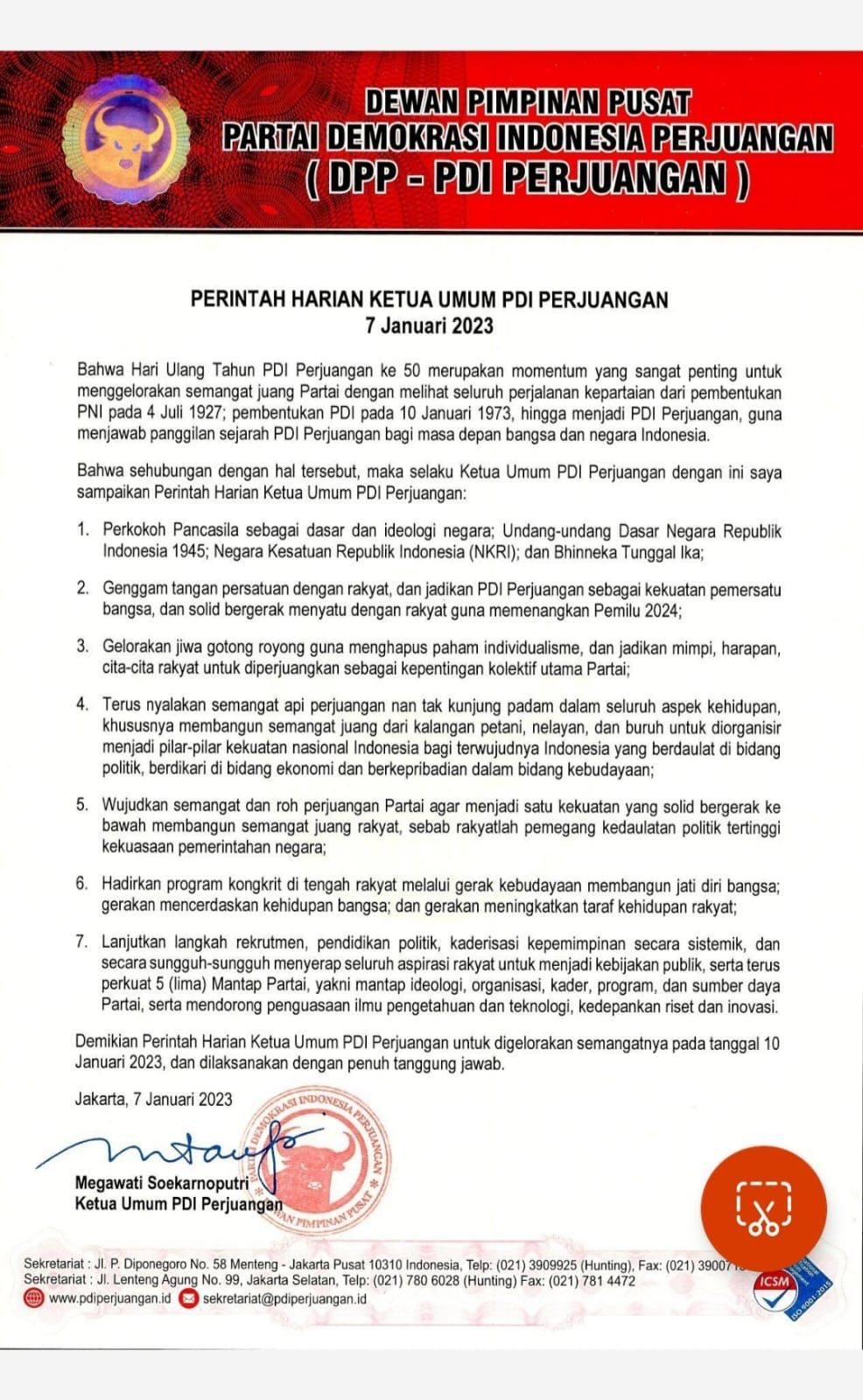 “Bahwa sehubungan dengan hal tersebut, maka selaku Ketua Umum PDI Perjuangan dengan ini saya sampaikan Perintah Harian Ketua Umum PDI Perjuangan,” demikian petikan surat perintah itu, seperti termuat dalam dokumen yang disampaikan kepada wartawan pada Sabtu (7/1/2023).