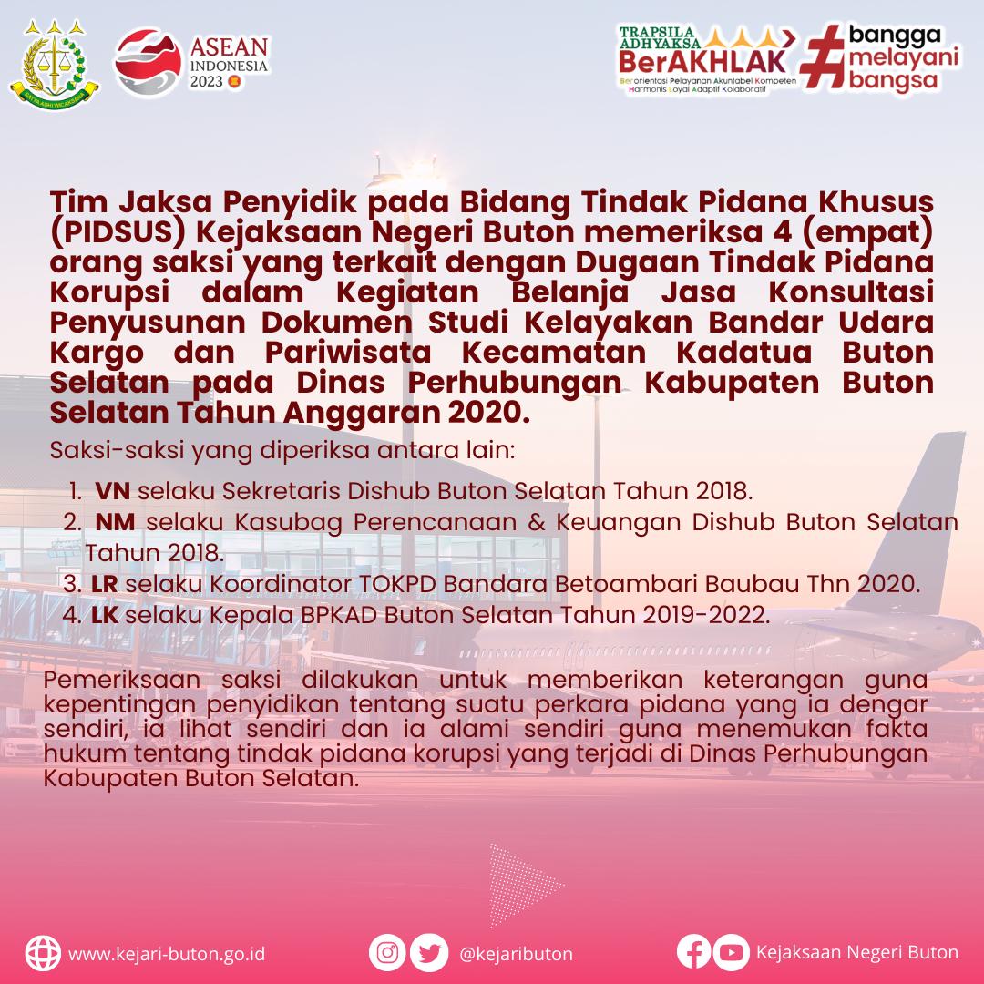 Keempat orang saksi yang diperiksa antara lain berinisial VN selaku Sekretaris Dishub Buton Selatan tahun 2018, NM selaku Kasubag Perencanaan dan Keuangan Dishub Buton Selatan tahun 2018.