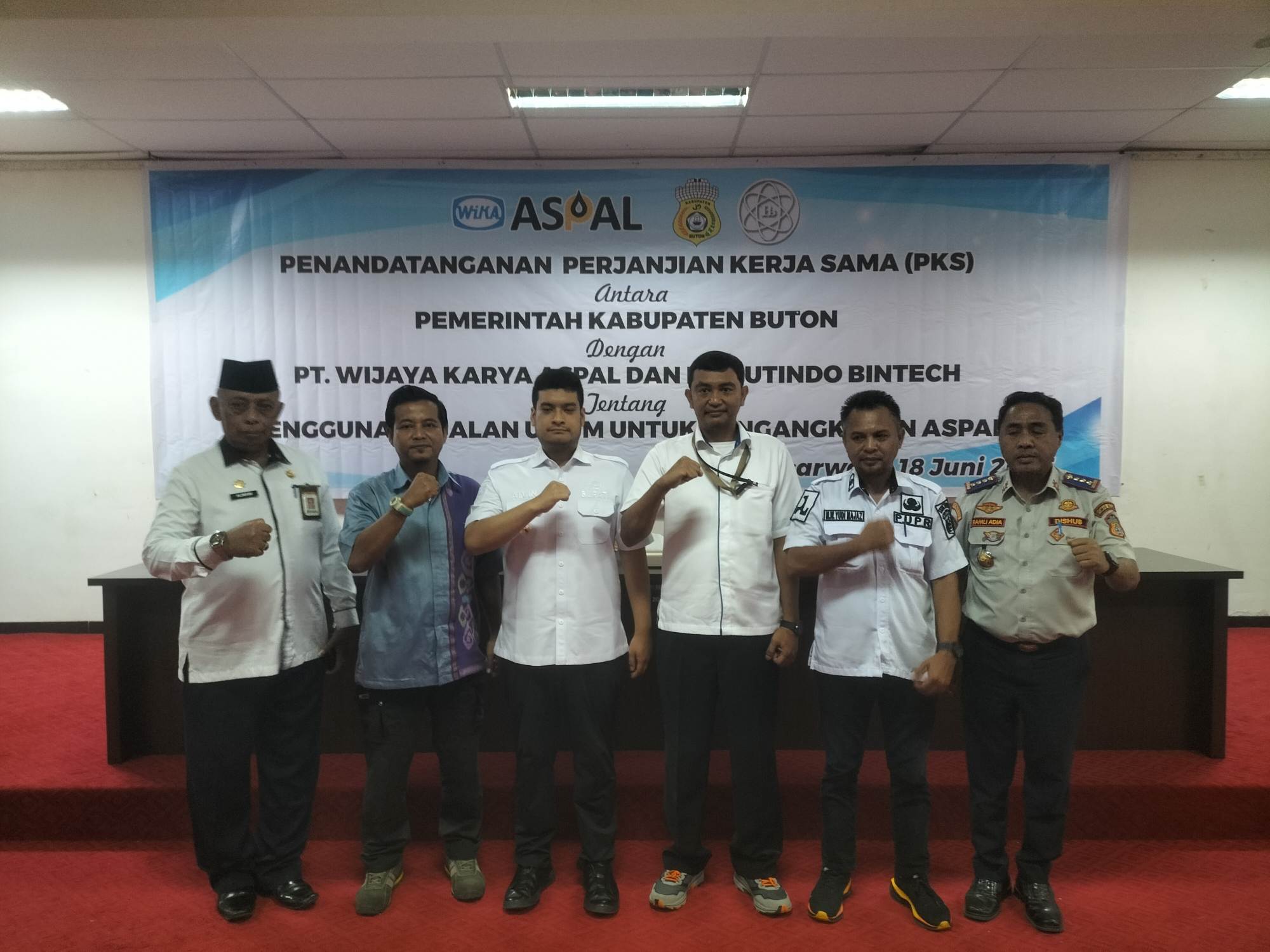 Bupati Buton menyaksikan langsung penandatanganan perjanjian kerjasama tersebut. Pemkab Buton diwakili oleh Kepala Dinas PUPR Wahyudin dan Kepala Dinas Perhubungan Ramli Adia. Sementara perusahaan aspal dari PT Wijaya Karya Aspal dan PT Putindo Bintech.