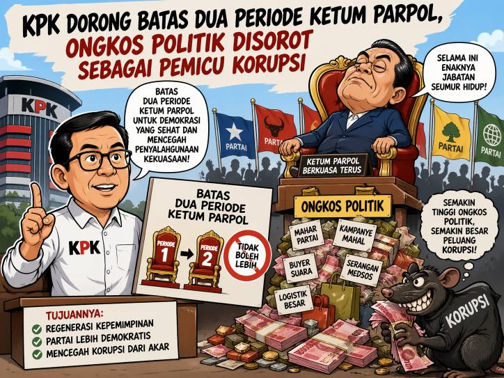 NARASITIME.com, Jakarta – Seperti dikutip dari laman Tempo, Komisi Pemberantasan Korupsi (KPK) mengusulkan pembatasan masa jabatan ketua umum partai politik maksimal dua periode. Rekomendasi ini merupakan bagian dari kajian tata kelola partai politik yang disusun Direktorat Monitoring KPK untuk menekan praktik korupsi yang berakar dari mahalnya biaya politik.
