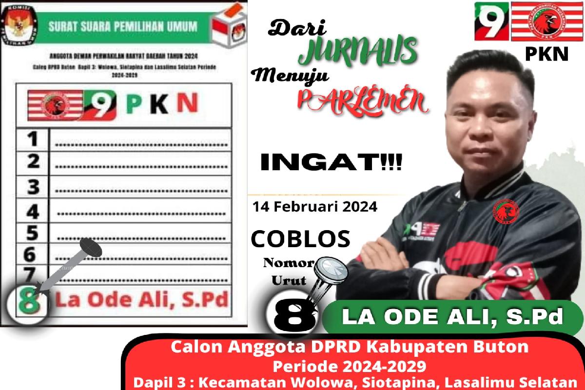 NARASITIME.com – Salah satu wartawan senior di Kabupaten Buton La Ode Ali, S.Pd maju sebagai Bakal Calon Legislatif (Bacaleg) Partai Kebangkitan Nusantara (PKN) pada Pemilu Legislatif (Pileg) 2024.