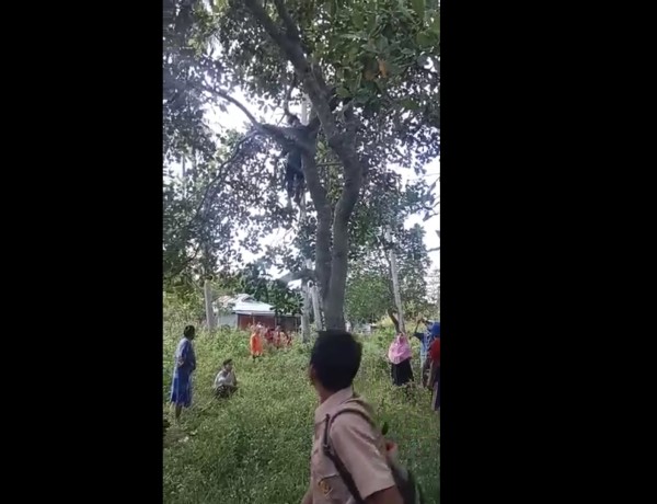 Jasad korban ditemukan warga dalam posisi tergantung di atas pohon jambu di Kelurahan Lakambau, Kecamatan Batauga, Kabupaten Buton Selatan (Busel), Sabtu (Mei 27, 2023).
