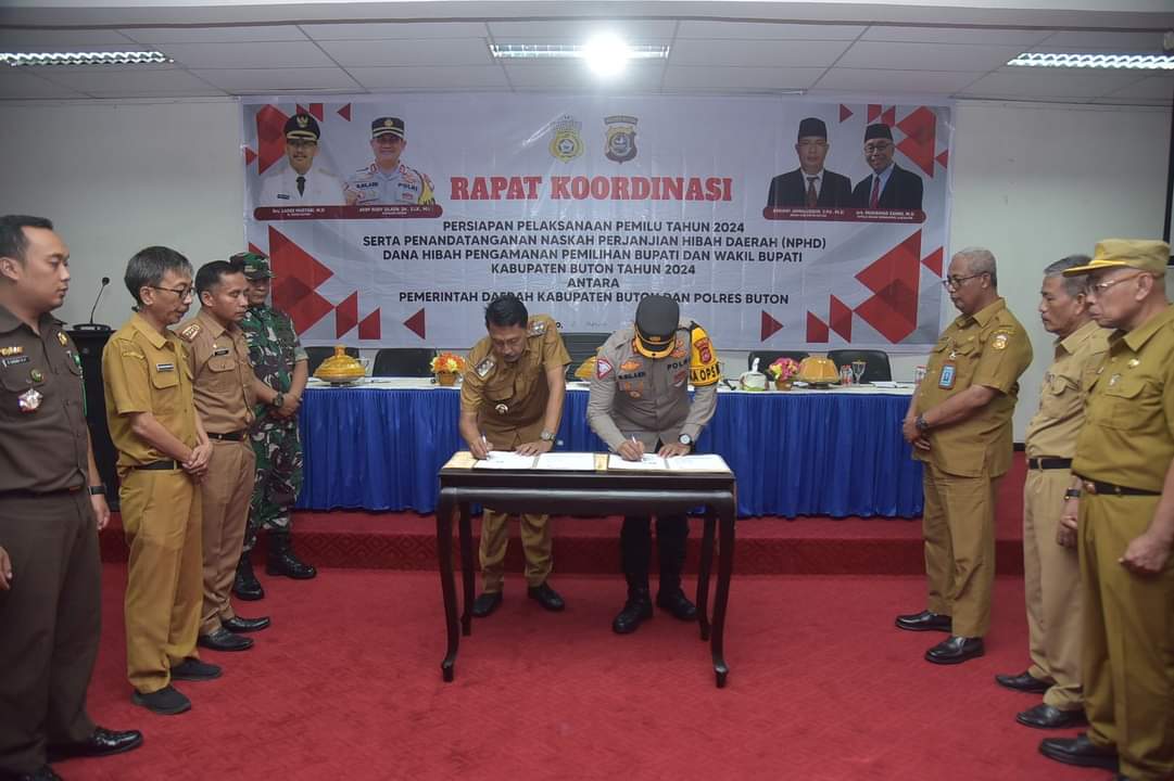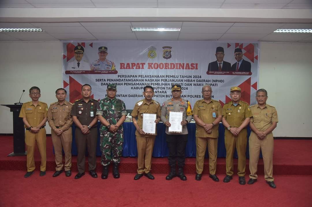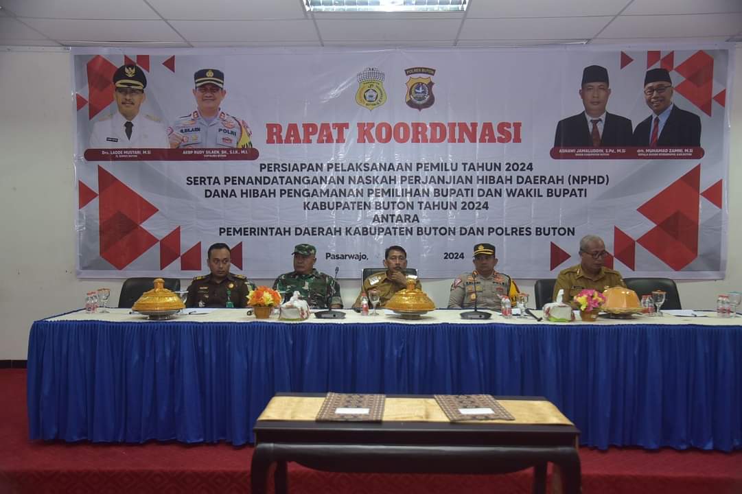 Hal ini dikatakan Pj Bupati Buton, Drs. La Ode Mustari, M.Si dalam Rapat Koordinasi Pelaksanaan Memilu tahun 2024 serta Penandatanganan Naskah Perjanjian Hibah Daerah (NPHD) Dana Pengamanan Pemilihan Bupati dan Wakil Bupati Buton tahun 2024 antara Pemerintah Kabupaten Buton dan Polres Buton bertempat di Aula kantor Bupati Buton, Senin, 12 Februari 2024.