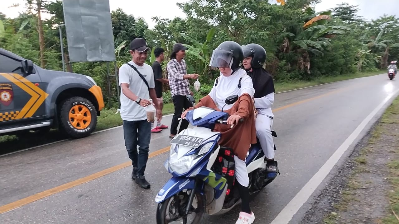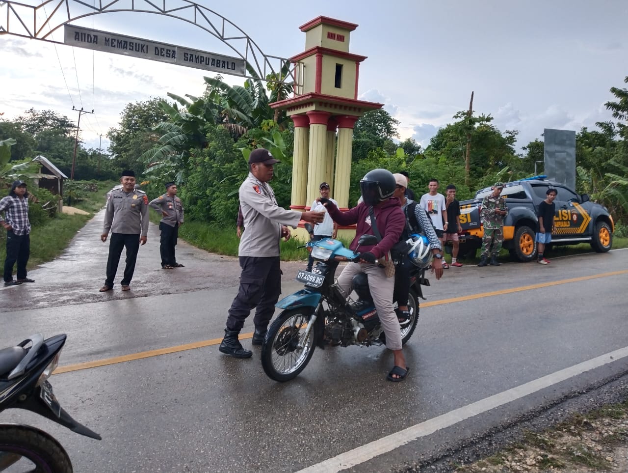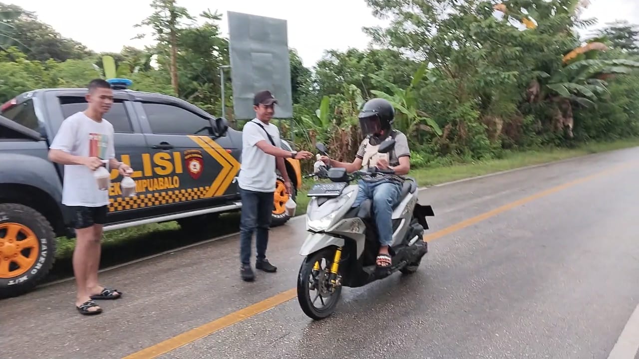 Kapolsek Sampuabalo Iptu Almuhalid, SH bersama Babinsa, pemuda dan anggota polsek setempat itu dengan tertib membagikan takjil kepada warga dan pengguna jalan yang melintas di pertigaan perbatasan Desa Gunung Jaya dan Desa Sampuabalo.