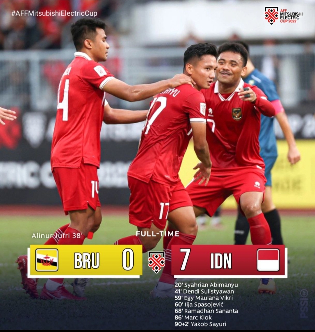 Dilansir dari Kompas.com, duel Brunei vs Indonesia pada fase grup A Piala AFF 2022 yang berlangsung di Stadion Kuala Lumpur, Malaysia, Senin (26/12/2022), Skuat asuhan Shin Tae-yong itu berhasil meraih kemenangan dengan skor 0-7.