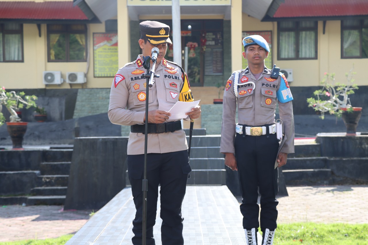 NARASITIME.com – Kapolres Buton, AKBP Rudy Silaen.,SH.,S.I.K.,MI. Kom memimpin upacara kenaikan pangkat 32 personel dan pelepasan 4 personel purna bakti Polres Buton di halaman Mapolres Buton, Selasa (02/1/2024).