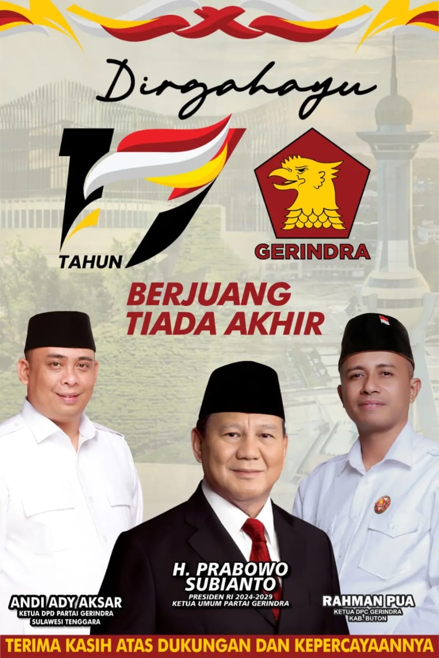 Ketua DPC Gerindra Buton Rahman Pua mengatakan, perayaan ulang tahun kali ini terasa istimewa karena Ketua Umum Partai Gerindra Prabowo Subianto telah mendapatkan mandat dari rakyat menjadi Presiden Indonesia yang ke-8.