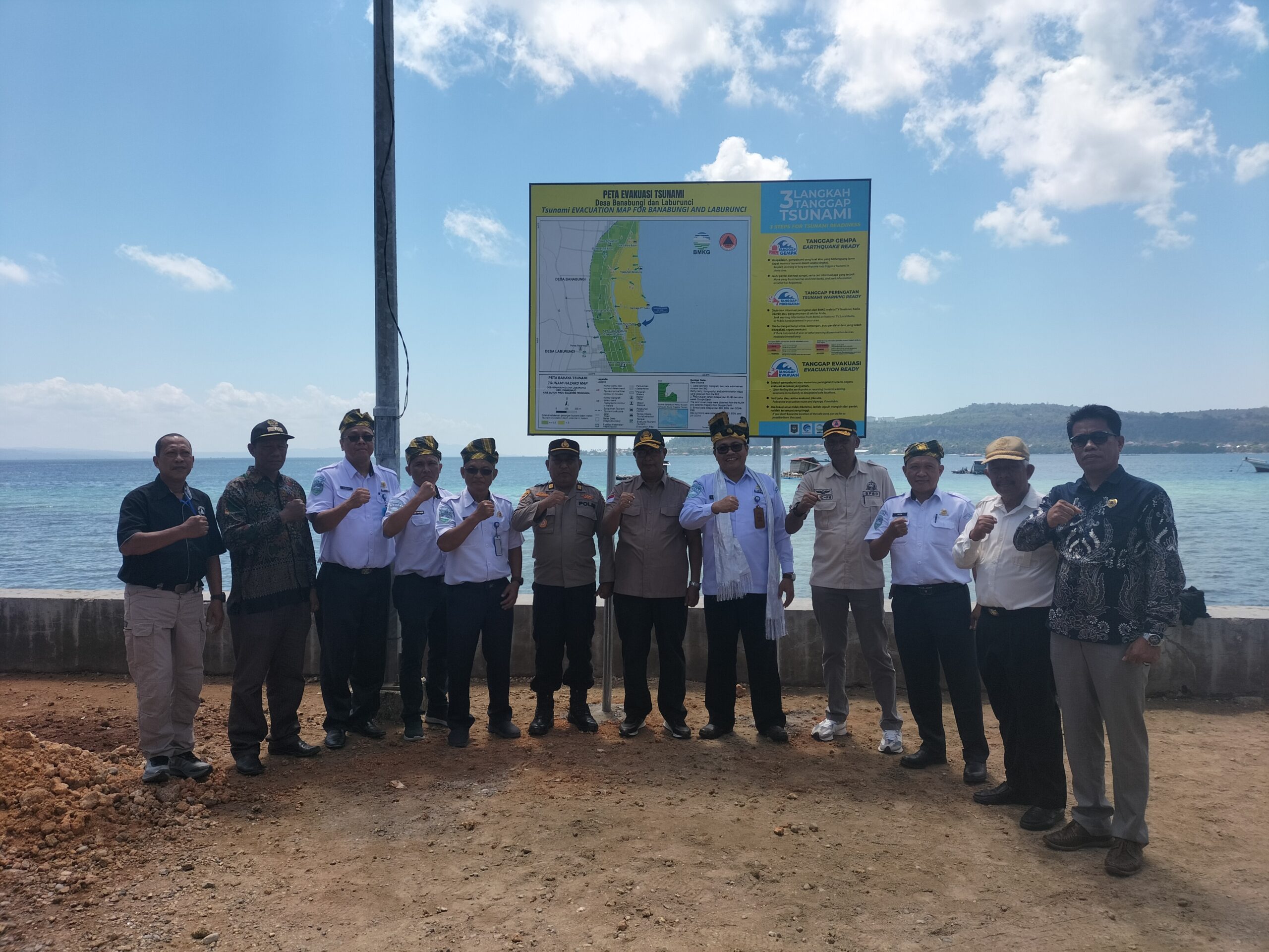 Selanjutnya, Sekda Buton bersama Kepala Balai Besar Meteorologi, Klimatologi, dan Geofisika Wilayah IV Makassar, Kepala Pelaksana BPBD Kabupaten Buton, Koordinator UPT BMKG Sultra, Kepala Stasiun Geofisika Kendari meluncurkan peta evakuasi bencana di Desa Banabungi, Kecamatan Pasarwajo, Kabupaten Buton.