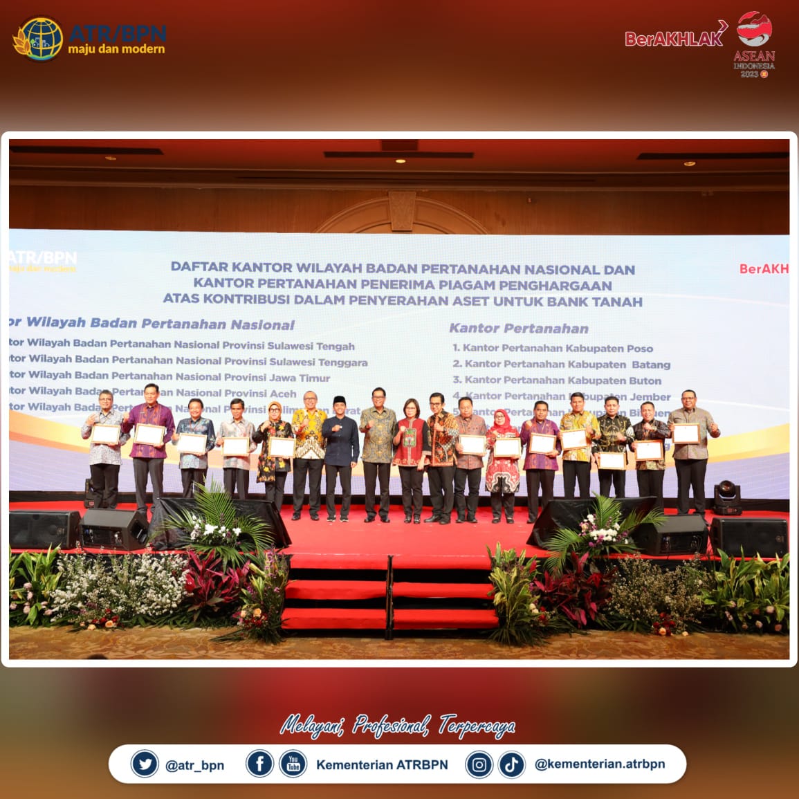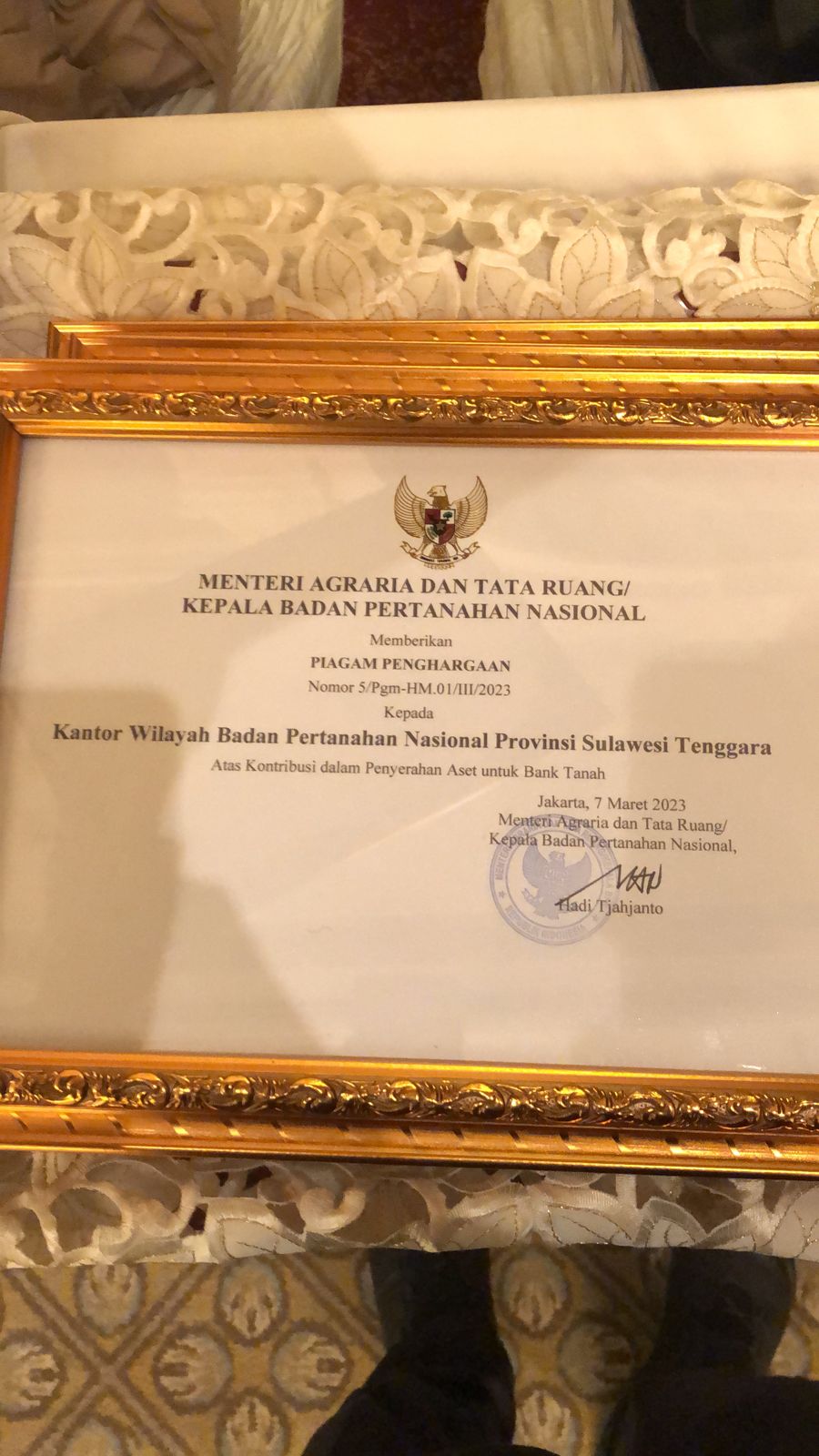 Penghargaan tersebut diserahkan oleh Wakil Menteri Agraria dan Tata Ruang/Kepala Badan Pertanahan Nasional Raja Juli Antoni yang didampingi oleh Kepala Badan Pelaksana Badan Bank Tanah Parman Nataatmadja kepada Dr. Andi Renald, S.T., M.T. Kepala Kantor Wilayah BPN Provinsi Sulawesi Tenggara.