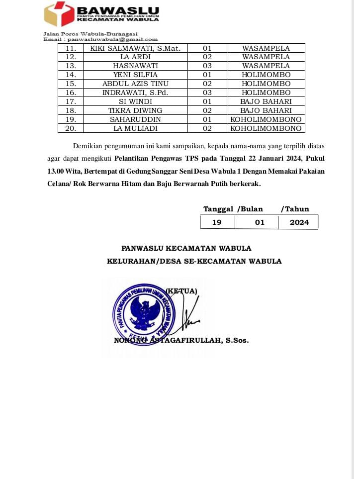 NARASITIME.com – Panwaslu Kecamatan Wabula, Kabupaten Buton resmi melantik 20 Pengawas Tempat Pemungutan Suara (PTPS) di Sekretariat Panwaslu setempat, Selasa (23/1/2024) kemarin.