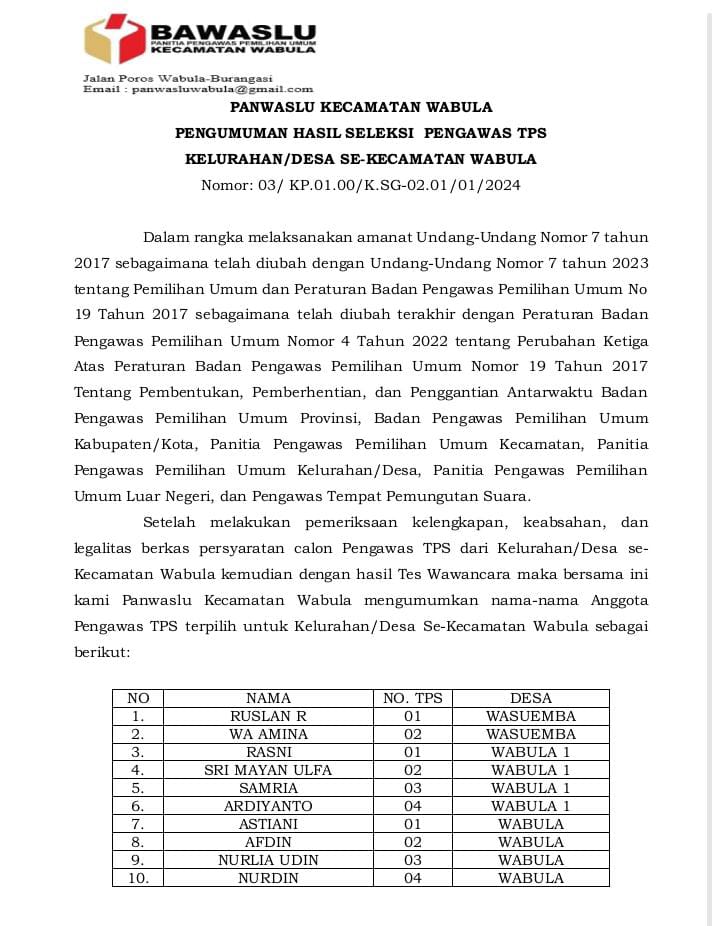 “Kemudian kami juga sebagai pengawas pemilu tingkat kecamatan ini berharap untuk kepala desa, camat, kapolsek dan babinsa ikut bersama-sama melakukan pengawasan di wilayah Kecamatan Wabula sehingga pelanggaran dan kecurangan bisa diminimalisir bahkan bisa dihilangkan di Kecamatan Wabula. Artinya, demokrasi itu dapat berjalan dengan baik tanpa ada kecurangan dan pelanggaran pemilu,” pungkasnya.